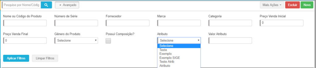 Na listagem de produtos, os dois últimos filtros referem-se aos campos personalizados. Primeiramente você deve selecionar qual atributo será utilizado no filtro e no próximo campo você digita a informação que foi preenchida no cadastro do produto e então clica em Filtrar.