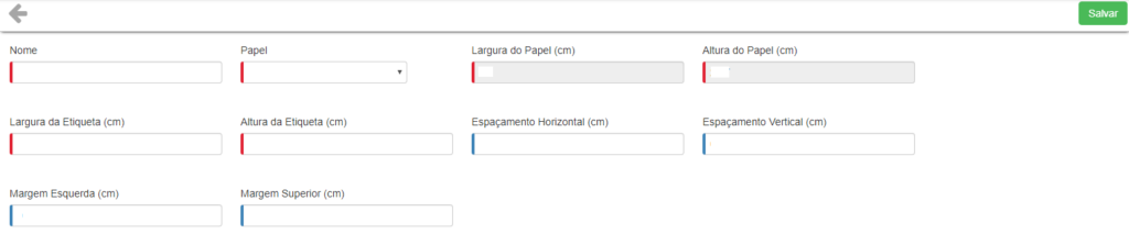 Para realizar o cadastro de um novo tamanho de etiqueta para impressão, clique no ícone localizado no canto superior da tela. Deverão então ser preenchidos os seguintes campos: